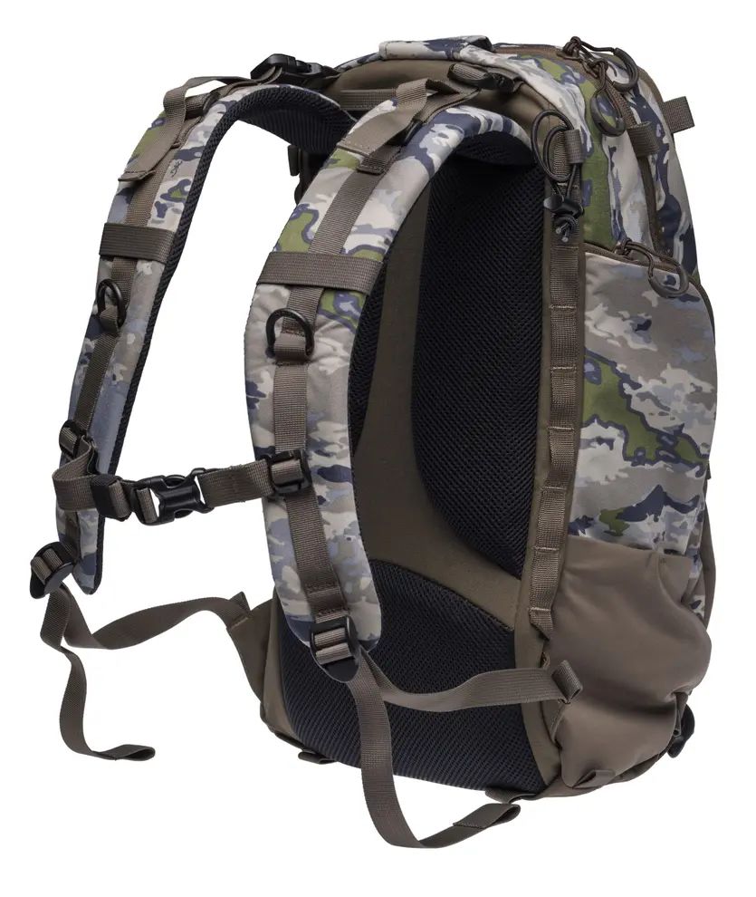 Constructed using tough, yet lightweight materials, this three compartment design features a main compartment that is expandable to hold bulky gear and includes a pocket, hangers, and a covered opening for a hydration bladder hose. The secondary compartment includes pockets for organizing smaller items. An exterior section is built from a stretch fabric and let's you quickly stuff away a jacket or other bulky gear. ¾ length pockets on each side are easy to reach and provide the perfect spot for larger equipment that needs to be accessed quickly without opening the main compartments. Large elastic side pockets are perfect for larger water bottles or trekking poles. A pair of web straps work with the included rifle or bow carrier keep your hands free when hiking or scrambling up steep slopes. Large zipper pulls throughout are easy to use with gloves. The included rain cover stores inside a pocket on the bottom.